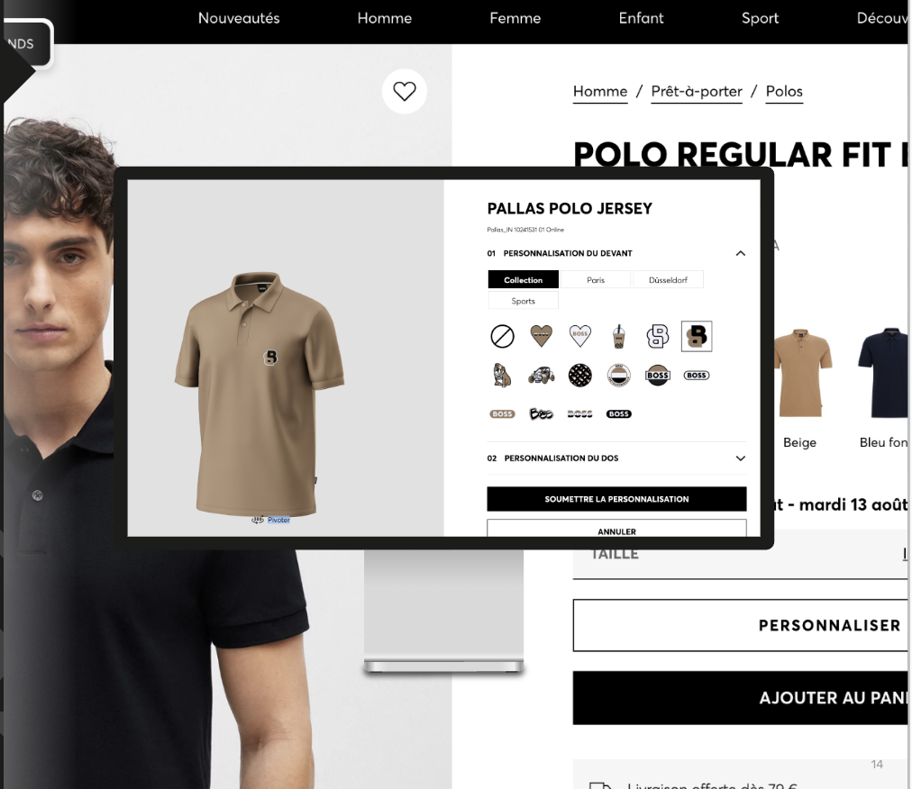 The Hugo Boss experience utilizes the YR Platform to offer high-fidelity 3D visualization through a unified product configurator. Whether customers are shopping online from one of the 10 live European sites or engaging with iPads in-store, they have access to a suite of premium personalization options: